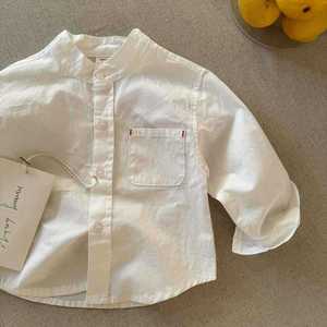 新款男女童春秋季棉衬衫儿童条纹上衣纯色宝宝口袋休闲打底白衬衣