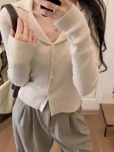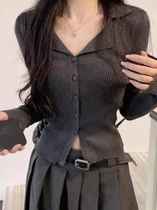 法式翻领长袖针织开衫女秋季2025新款小众设计感修身打底短款上衣