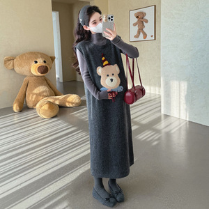 现货~2025秋冬新款孕妇韩版刺绣卡通小熊毛衣背心裙+打底套装