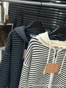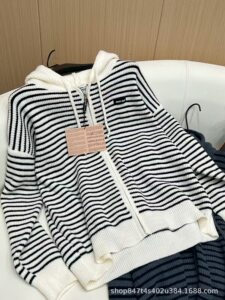 25miu条纹连帽毛衣外套女秋冬款软糯宽松百搭拉链针织开衫女