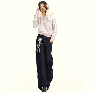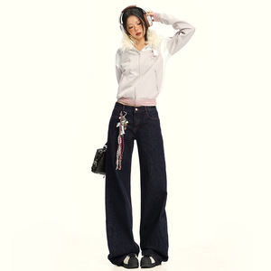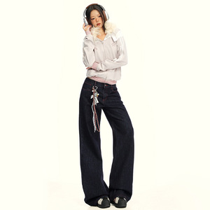 韩版撞色丹宁原牛牛仔裤直筒女秋季新款深色宽松松弛感水洗牛仔