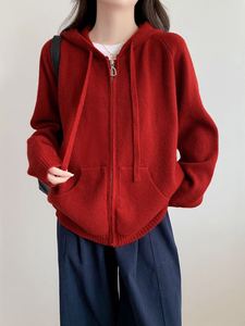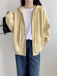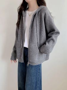 春秋新款女装宽松连帽双拉链针织衫外套休闲百搭长袖毛衣气质上衣
