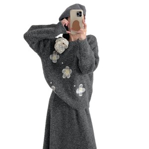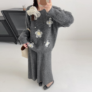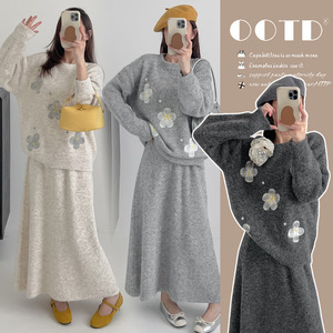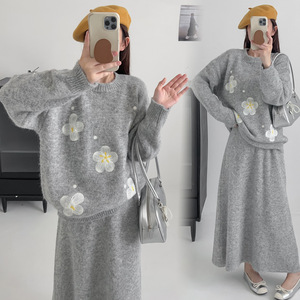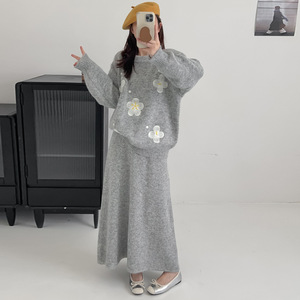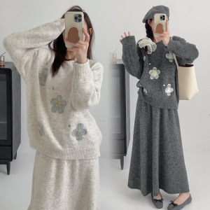 孕妇装秋冬套装潮妈新款韩版设计感花朵气质针织开衫半身裙两件套