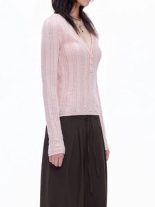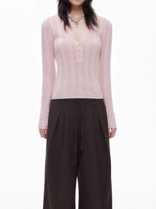 槿一 藕粉色V领毛织上衣女2025FW竖坑条螺纹镂空羊毛混纺针织衫潮