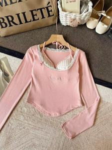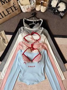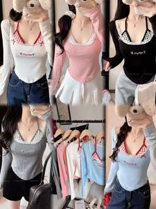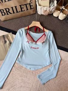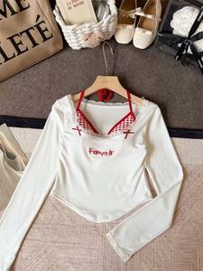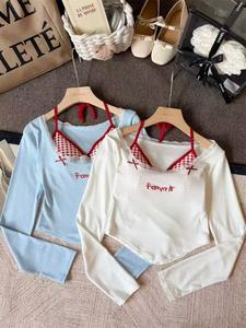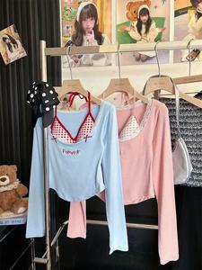 蝴蝶结刺绣假两件长袖T恤女秋季修身甜辣妹格子挂脖内搭短款上衣