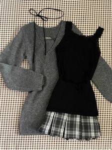 2025韩系古着感V领毛衣女秋冬季新款灰色收腰显瘦软糯针织上衣