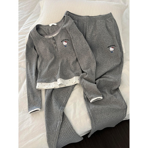 韩版撞色带胸垫坑条长袖睡衣女秋季新款HelloKitty休闲家居服套装