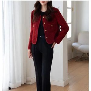 新款2024重工酒红色小香风外套女秋冬法式气质百搭名媛粗花呢上衣