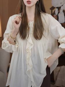 棉系带荷叶边长袖衬衫设计感花瓣袖早秋气质小众法式上衣女