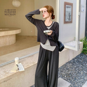 韩系休闲运动套装女2025秋季新款慵懒风条纹背心开衫阔腿裤三件套