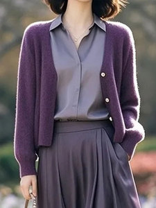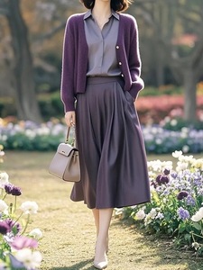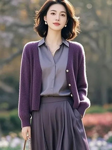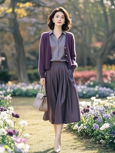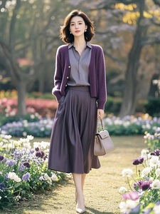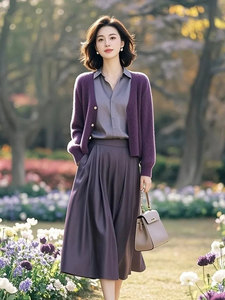 2025秋冬季韩系风格穿搭一整套紫色针织开衫灰紫色半身裙三件套装