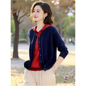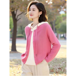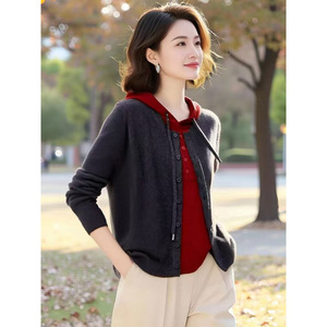 鸿5081假两件大码连帽洋气外搭外套加厚宽松毛衣时髦卫衣针织开衫