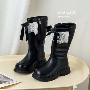 2025年冬季新款儿童时尚蕾丝蝴蝶结软皮加绒中筒靴