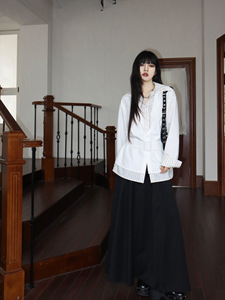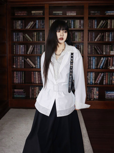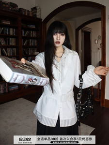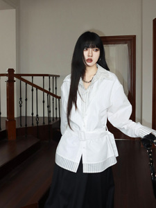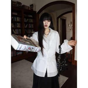 呆毛秋季立领假两件拼接条纹衬衫女2025新款宽松显瘦收腰白色上衣