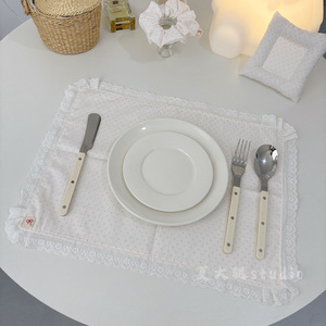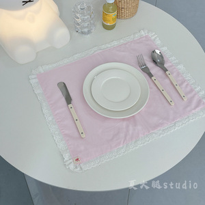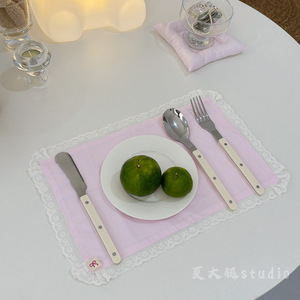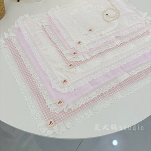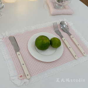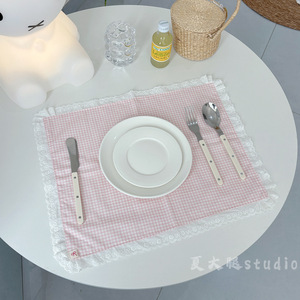 ins风粉色格子波点纯棉花边餐垫隔热茶桌垫餐布拍照美食餐巾杯垫