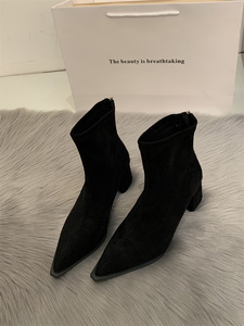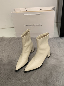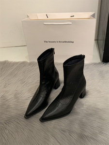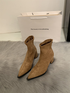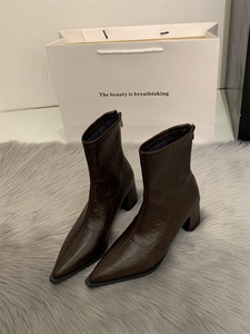 棕色短靴女高跟秋冬新款加绒法式小踝靴后拉链弹力尖头粗跟瘦瘦靴