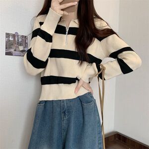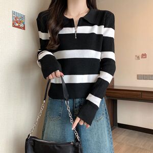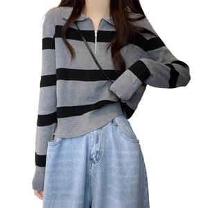 条纹针织衫上衣女2025新款秋翻领女士毛衣高知穿搭长袖打底衫