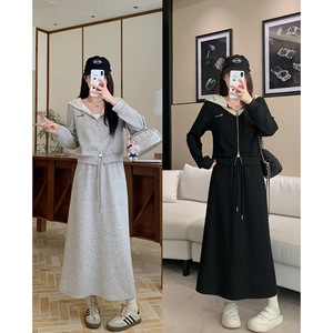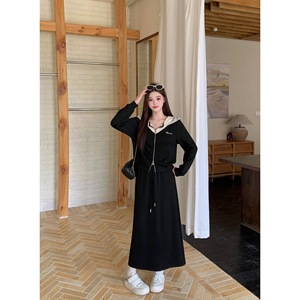 实拍2025秋胖mm大码黑色蕾丝拼接连帽卫衣外套半身裙两件套64171