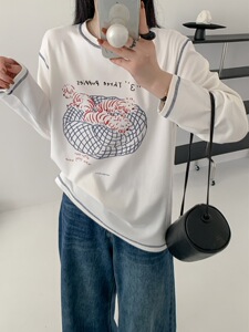 明线长袖T恤女卡通小狗印花宽松圆领套头衫秋季新款上衣服teeZL6