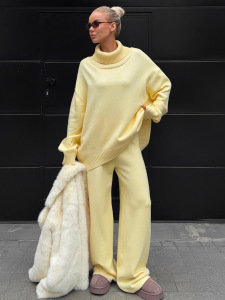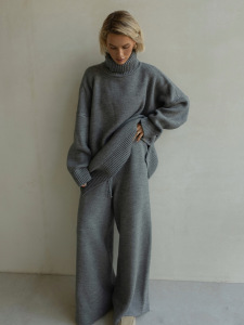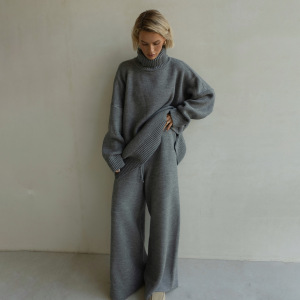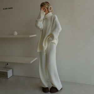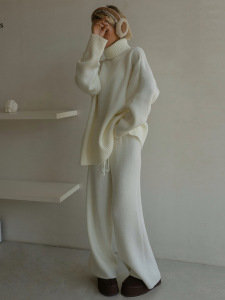 跨境套头高领毛衣套装女早秋慵懒上衣宽松阔腿裤柔软亲肤两件套装