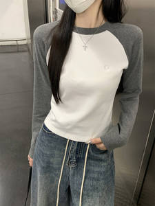 减龄短款打底衫女别致插肩拼色圆领长袖2025秋新款内搭甜酷风上衣