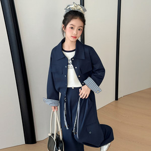 女童秋季休闲工装外套阔腿长裤三件套春秋中大童口袋阔腿裤夹克衫