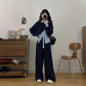 衬衫拼接假两件卫衣套装女2025秋季设计感时尚宽松阔腿裤两件套