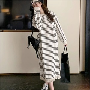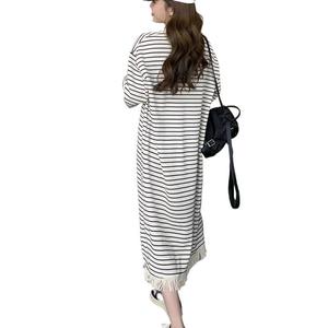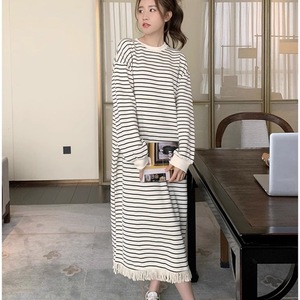 长袖条纹连衣裙女秋新款宽松时尚减龄流苏边卫衣裙长款过膝长裙