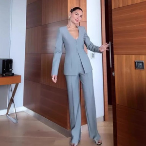 2025秋季新款欧美亚马逊跨境外贸女装v领气质修身浅蓝色西服套装
