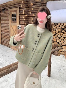 跨境绿色双面羊绒大衣女短5新韩版时尚排宽松百搭毛呢外套黄色炭
