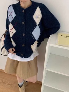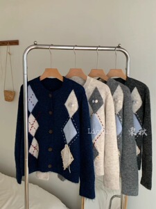 氛围感穿搭复古菱格圆领毛衣外套女秋冬宽松软糯慵懒针织开衫上衣