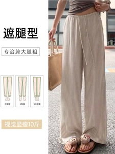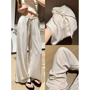 亚麻条纹裤子女秋季款2025新款日系高腰垂感慵懒风棉麻休闲阔腿裤