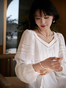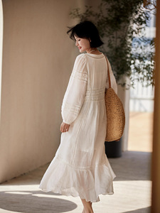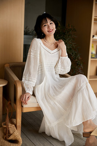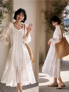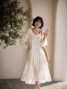 南油原创设计女装复古田园风白色连衣裙镂空蕾丝拼接压褶仙女裙
