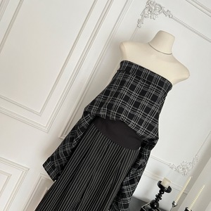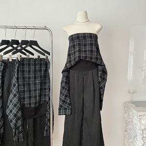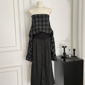 慵懒风简约2025新款秋季黑白格纹设计一字肩收腰长袖上衣长裤女