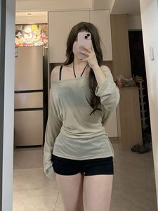 纯欲风辣妹空调衫后背绑带斜肩长袖T恤女秋季露肩防晒罩衫上衣潮