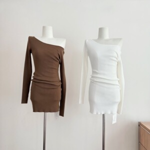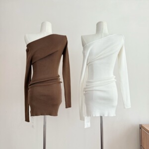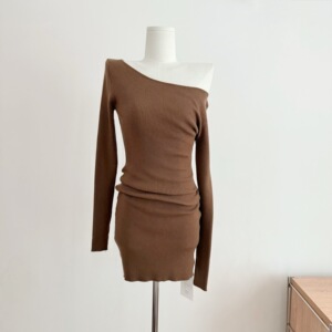 纯欲斜肩宽松慵懒毛织连衣裙秋季新款修身显瘦短款针织裙