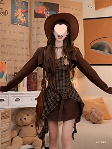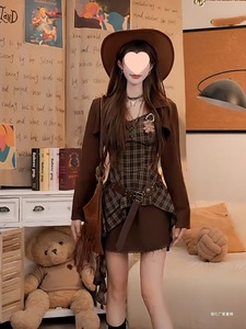 早秋复古美拉德不规则设计感格纹吊带连衣裙长袖百搭开衫两件套装