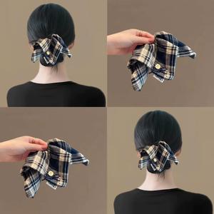 复古法式秋冬格纹撞色方巾发圈纽扣复古发饰头绳2025新款女丸子