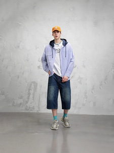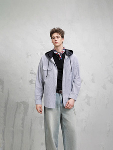 韩系2025新款潮流衬衫复古时尚休闲连帽衬衫美式做旧线条纯色衬衫