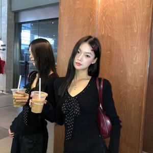 法式复古波点拼接蝴蝶结长袖T恤女春秋新款修身显瘦减龄百搭上衣