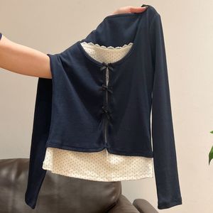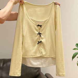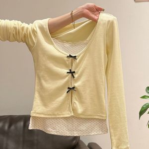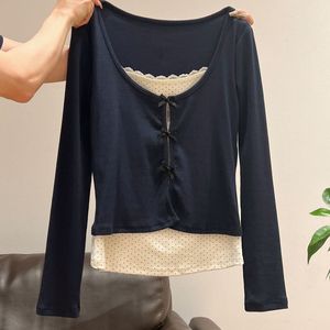 蝴蝶结假两件蕾丝长袖T恤女2025春秋新款修身显瘦甜美气质上衣潮