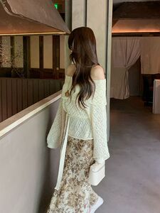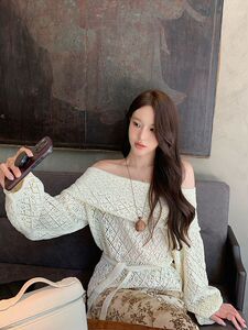 纯欲风镂空针织衫女长袖秋冬季2025新款慵懒风小众一字领露肩上衣