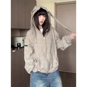 美式复古兔子耳朵条纹卫衣女秋季设计感小众甜酷宽松连帽外套潮牌