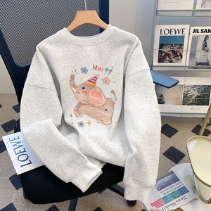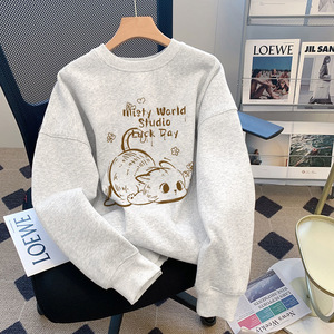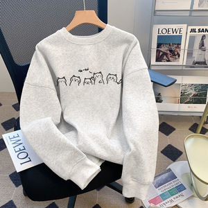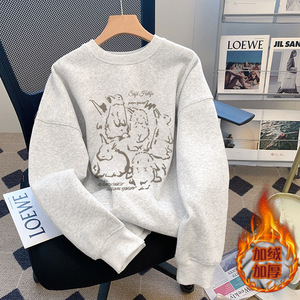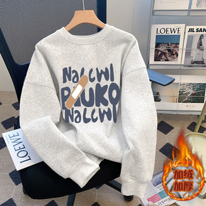 白灰色圆领长袖女卫衣外套无帽2025新款秋冬季休闲宽松大码上衣潮