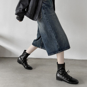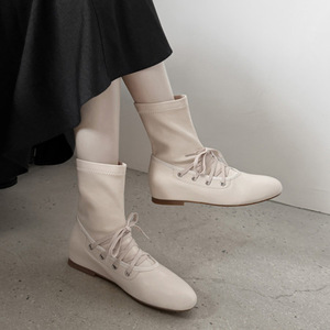 秋冬米白色短靴低跟真皮马丁靴粗跟短筒瘦瘦靴平底复古小众女靴子
