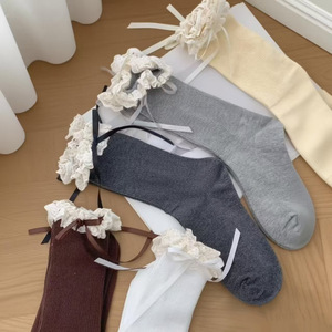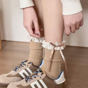 百搭白色蕾丝花边女春秋款中筒堆堆袜子蝴蝶结lolita学院风韩版