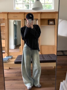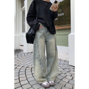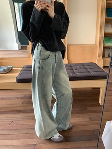 Vs what「露思style」水洗做旧弯刀牛仔裤女解构宽松阔腿直筒长裤