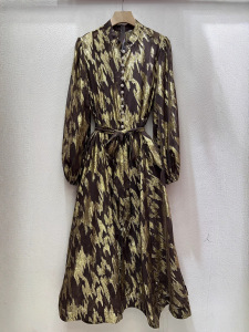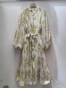 2025春秋新款圆领钉钻纽扣金线提花宽松长裙连衣裙配腰带跨境