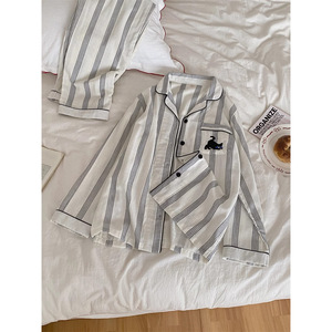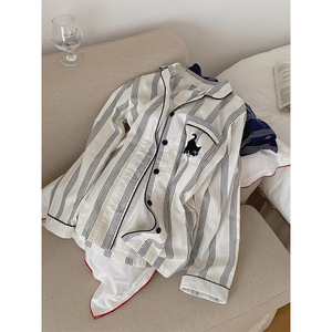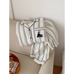 日系条纹睡衣女春秋季长袖套装高级感大码跨境家居服网红风可外穿