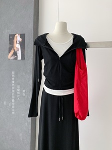 韩系假两件连帽撞色卫衣半身裙套装2025早秋新款简约运动风两件套